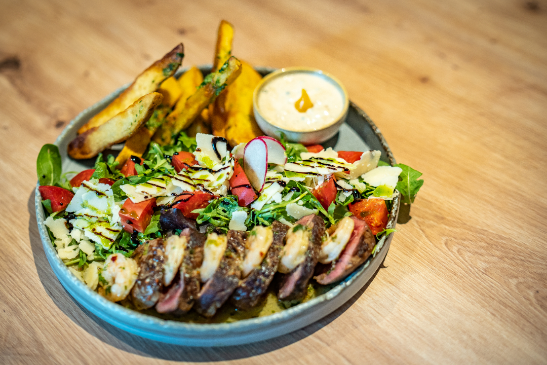 - Ingrediente: mușchi de vită, cartofi copți picurati cu ulei gremolada(ulei de masline, usturoi si patrunjel), creveți, mix de salată, roșii cherry, sos piper verde, parmezan